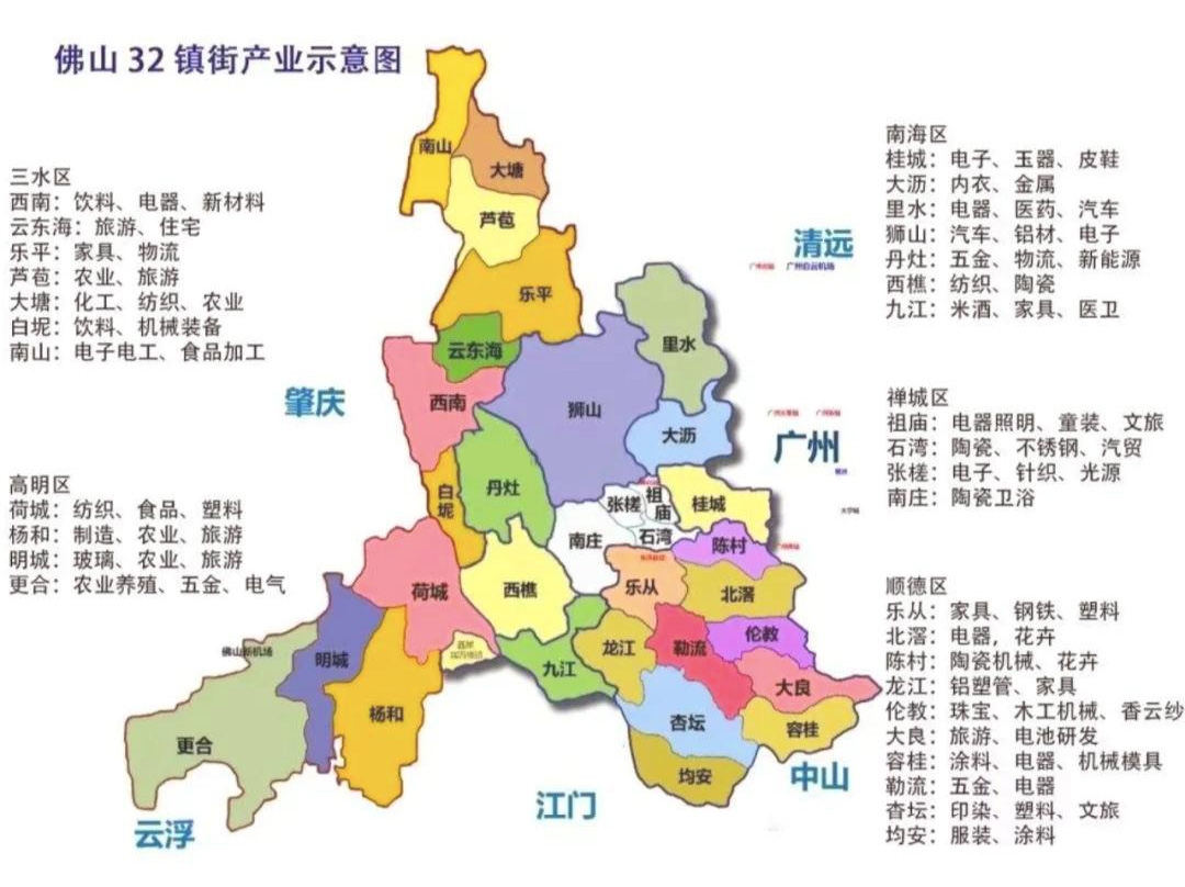 📍顺德区:乐从镇以家具、钢铁、塑料产业闻名,北滘镇则电器与花卉产业突出。