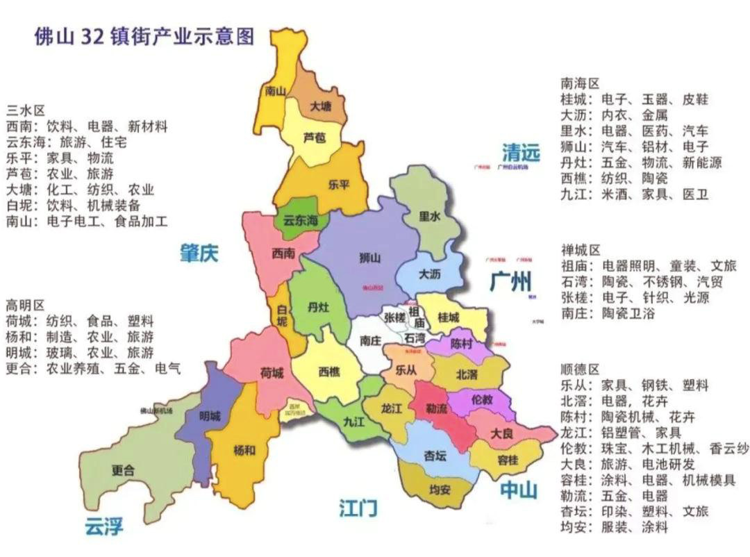 📍顺德区:乐从镇以家具、钢铁、塑料产业闻名,北滘镇则电器与花卉产业突出。